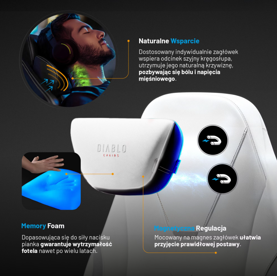 Jedną z najczęstszych dolegliwości wśród graczy jest ból i napięcie w okolicy karku. Ale nie z fotelem Diablo X.Eye Prime! Specjalny magnetyczny zagłówek perfekcyjnie stabilizuje odcinek szyjny kręgosłupa i sprzyja przyjęciu ergonomicznej postawy. Mocowanie zagłówka na magnes to strzał w dziesiątkę – nic nie przesuwa się bez Twojej zgody i nie przeszkadza w działaniu. Znajdująca się w środku pianka Memory wzorowo dopasowuje się do Twojej sylwetki.