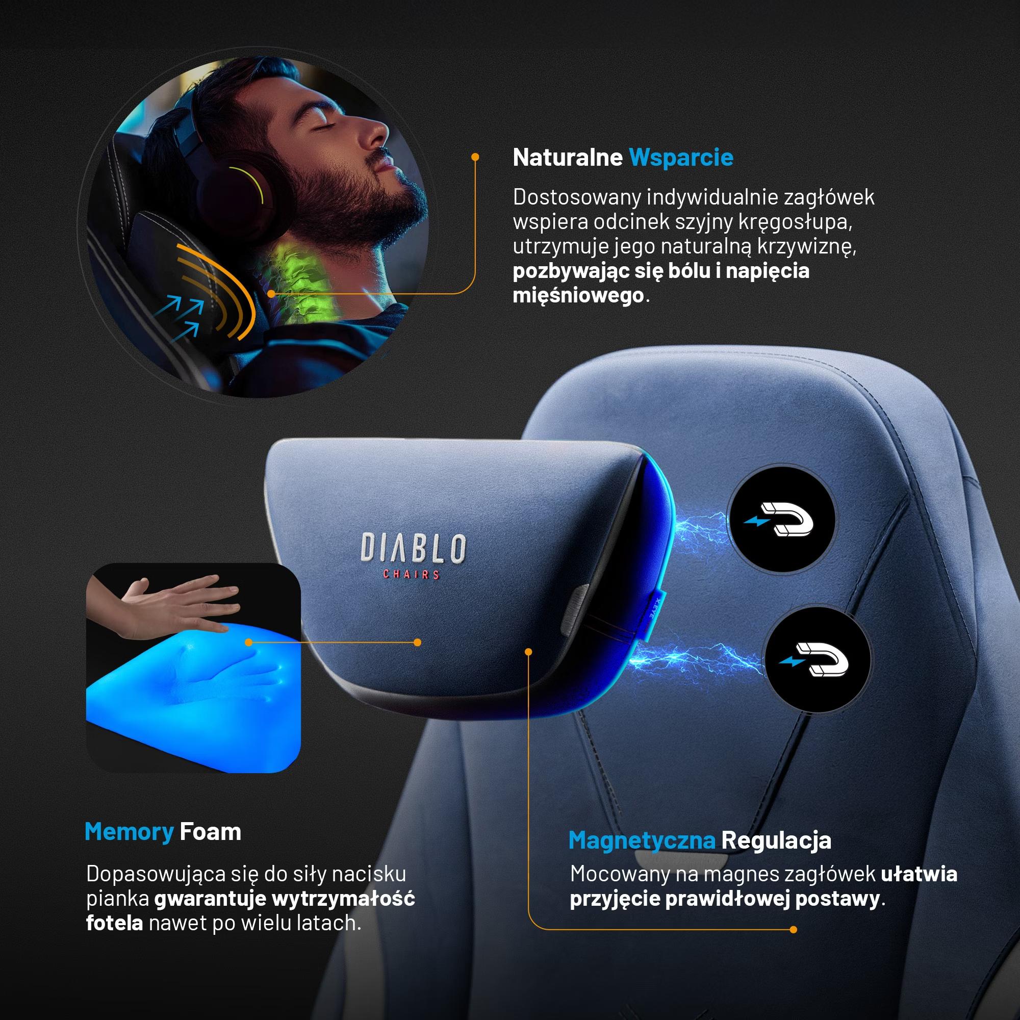 Jedną z najczęstszych dolegliwości wśród graczy jest ból i napięcie w okolicy karku. Ale nie z fotelem Diablo X.Eye Prime! Specjalny magnetyczny zagłówek perfekcyjnie stabilizuje odcinek szyjny kręgosłupa i sprzyja przyjęciu ergonomicznej postawy. Mocowanie zagłówka na magnes to strzał w dziesiątkę – nic nie przesuwa się bez Twojej zgody i nie przeszkadza w działaniu. Znajdująca się w środku pianka Memory wzorowo dopasowuje się do Twojej sylwetki.