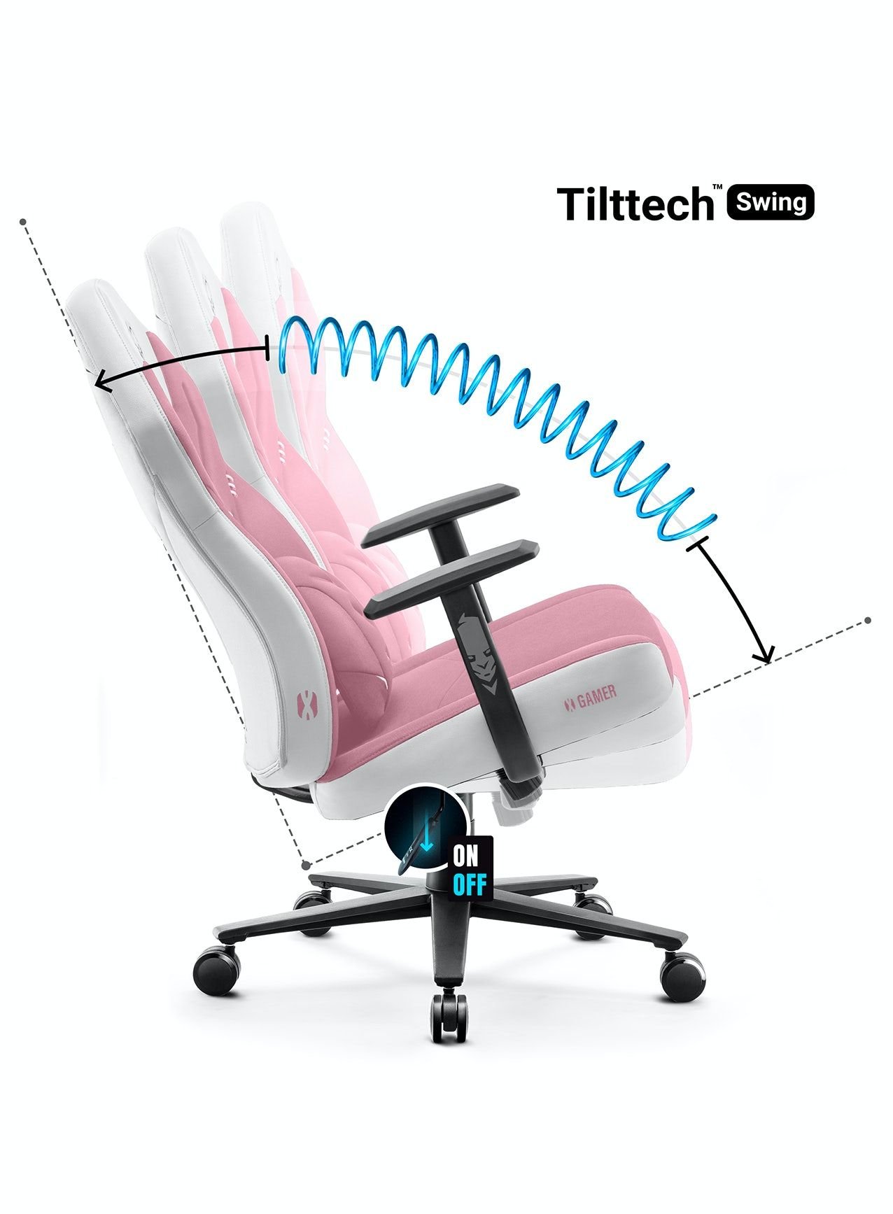 Nasz fotel gamingowy odchyli się nawet do 115°! Pozwala na to wbudowany mechanizm Tilttech™ Swing, dzięki któremu zyskasz bezpieczną funkcję relaksującego odchylania siedziska wraz z oparciem. System pozwala dodatkowo na regulację siły nacisku niezbędnej do bujania się, dopasujesz więc mechanizm do swojej wagi i zyskasz dodatkowe punkty bezpieczeństwa.
