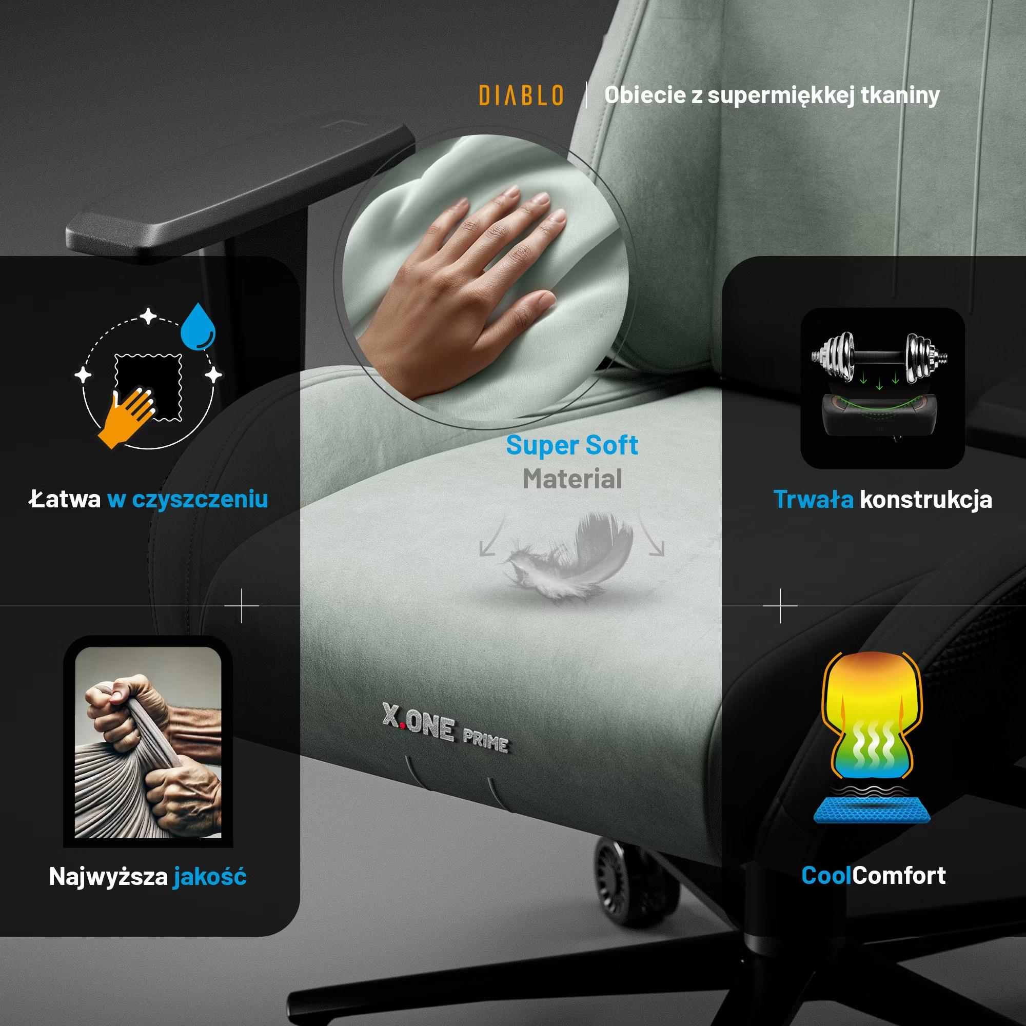 Tapicerka w fotelu X.One Prime to bez wątpienia klasa światowa! Mocna i odporna na przetarcia tkanina GentlePro™ jest praktycznie niezniszczalna i świetnie radzi sobie z codziennym intensywnym użytkowaniem. Jednocześnie materiał pozwala skórze oddychać i otula aksamitną miękkością.