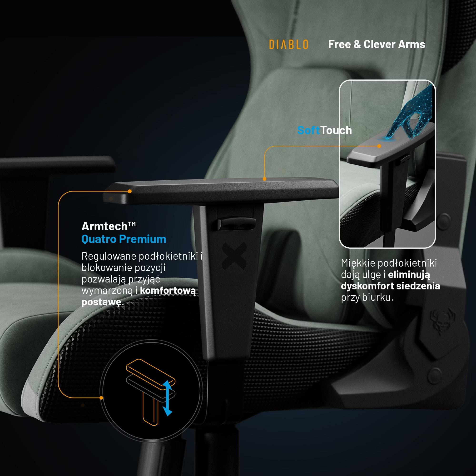 Na profesjonalne oparcie mogą liczyć też barki i ramiona. Podłokietniki Armtech™ Vertical SoftTouch z regulacją gwarantują świetną stabilizację dla przedramion. Z łatwością utrzymasz barki i łokcie w prawidłowej pozycji, a miękkie wykończenie podłokietników przyniesie ulgę nawet po godzinach siedzenia w fotelu.