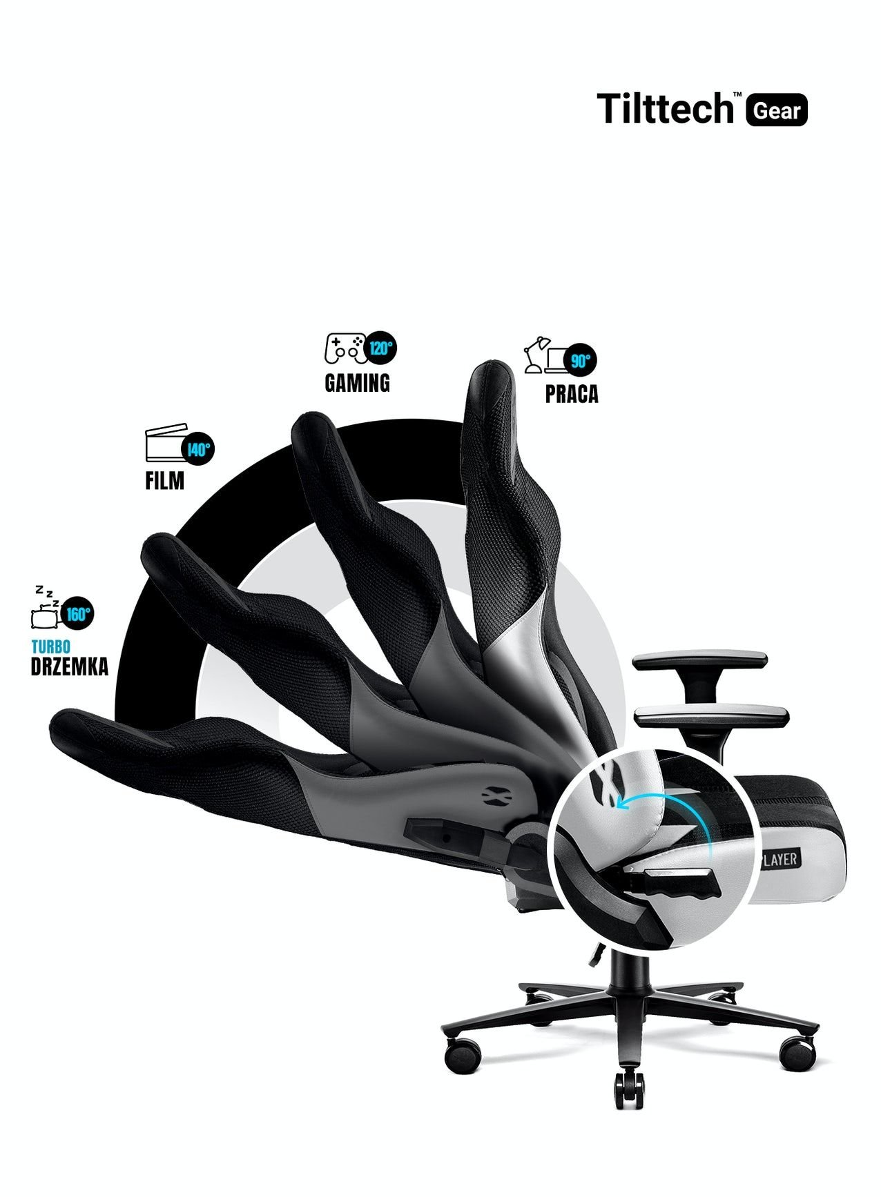 Regulację wysokości fotela względem wzrostu umożliwia system Tilttech Butterfly. Właściwa regulacja sprawi, ze za każdym razem przyjmiesz komfortową i ergonomiczną pozycję. Odpowiedni kąt nachylenia oparcia dopasujesz z mechanizmem Tilttech Gear, a komfort i mnóstwo dodatkowej przyjemności zapewni Ci funkcja bujania z systemem Tilttech Swing.