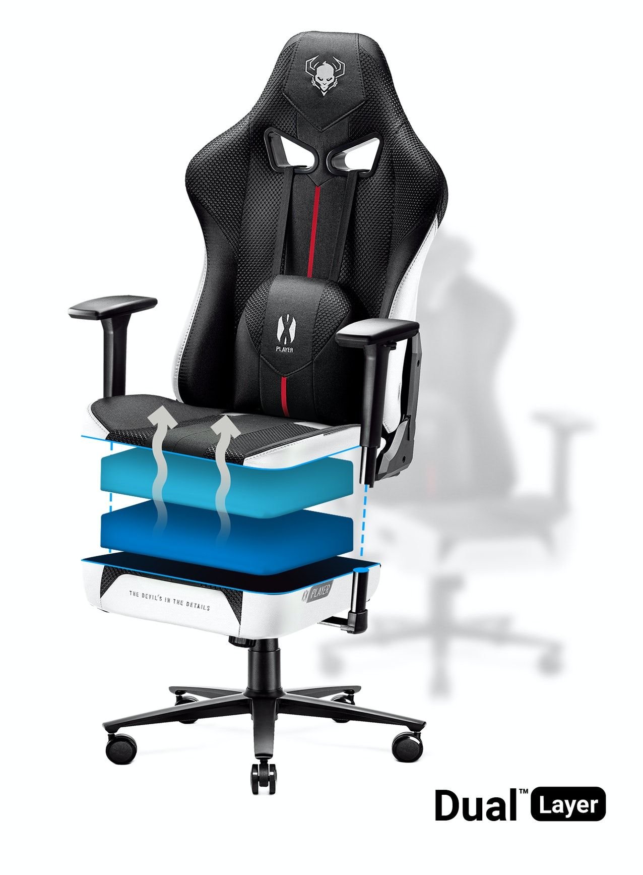 Komfort podczas gamingu w ciepłe dni zapewni Ci materiałowa tapicerka z włókna EcoFiber oraz siateczki Diablo Honeycomb. Tkaniny są niezwykle odporne na przetarcia oraz gwarantują niezbędną cyrkulację powietrza, a mocne przeszycia Nylon LV3 zapewniają im doskonałe napięcie.