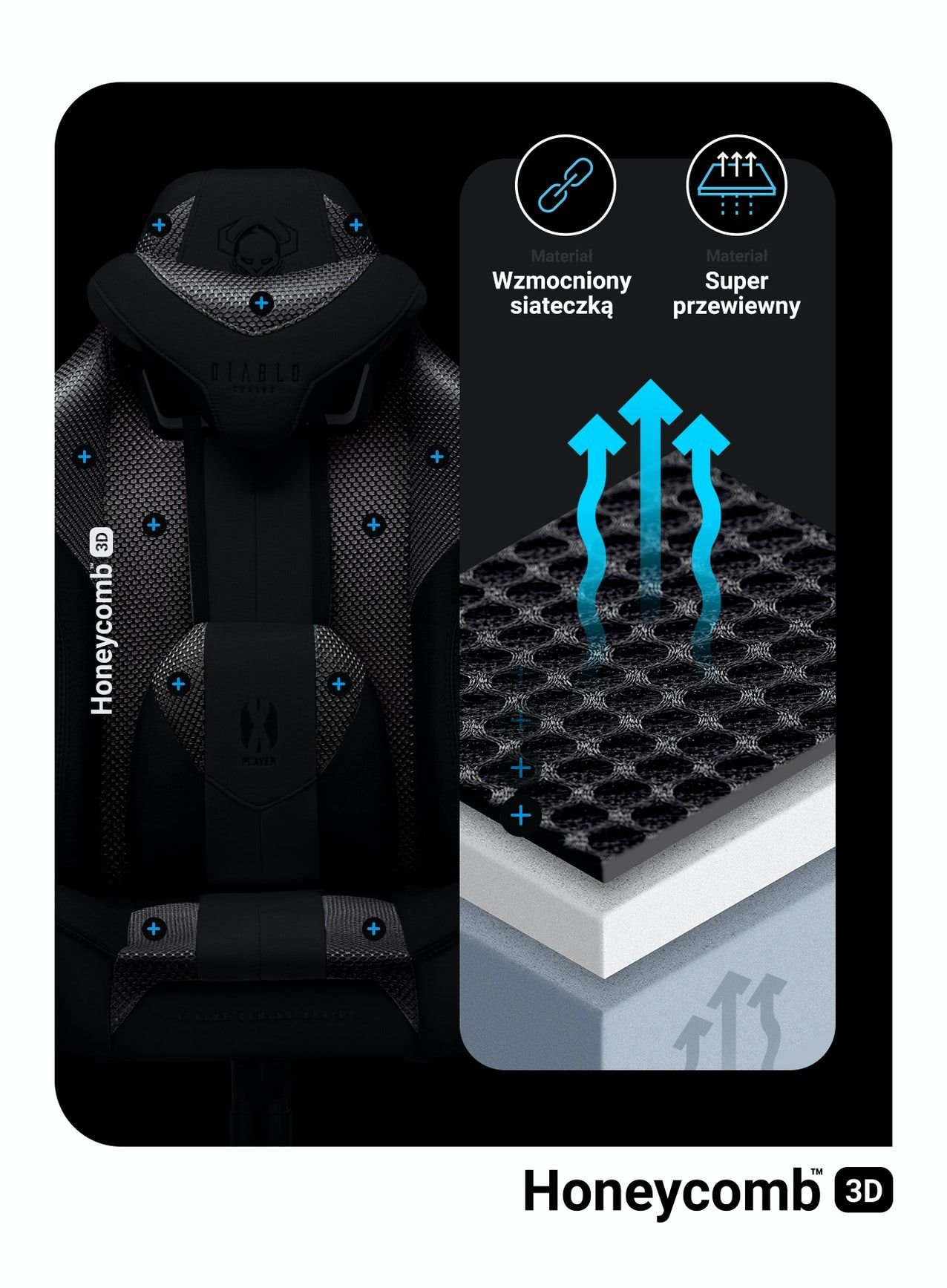 Tkanina EcoFiber oraz siateczka Diablo Honeycomb tworzą odporną na przetarcia, materiałową tapicerkę, która zapewni Ci niezbędną cyrkulację powietrza. Odpowiednia przewiewność sprawi, że nawet podczas wysokiej temperatury zyskasz pełen komfort pracy, nauki i rozrywki przy biurku.