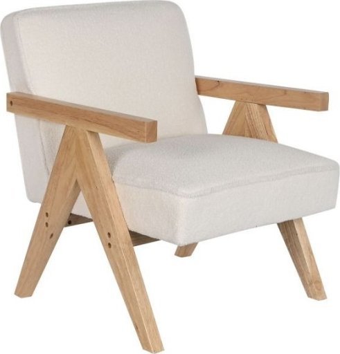 Bardzo ciekawy fotel, którego design nawiązuje do ikonicznych wzorców z przeszłości, przenosząc je z powodzeniem do współczesnego wnętrza. Konstrukcja i podłokietniki są wykonane z jasnego drewna. Obity miękką, poliestrową tkaniną bouclé w kolorze białym nadaje fotelowi luksusowy wygląd. Mebel jest bardzo wygodny i będzie pasował do wielu stylów wystroju wnętrz.