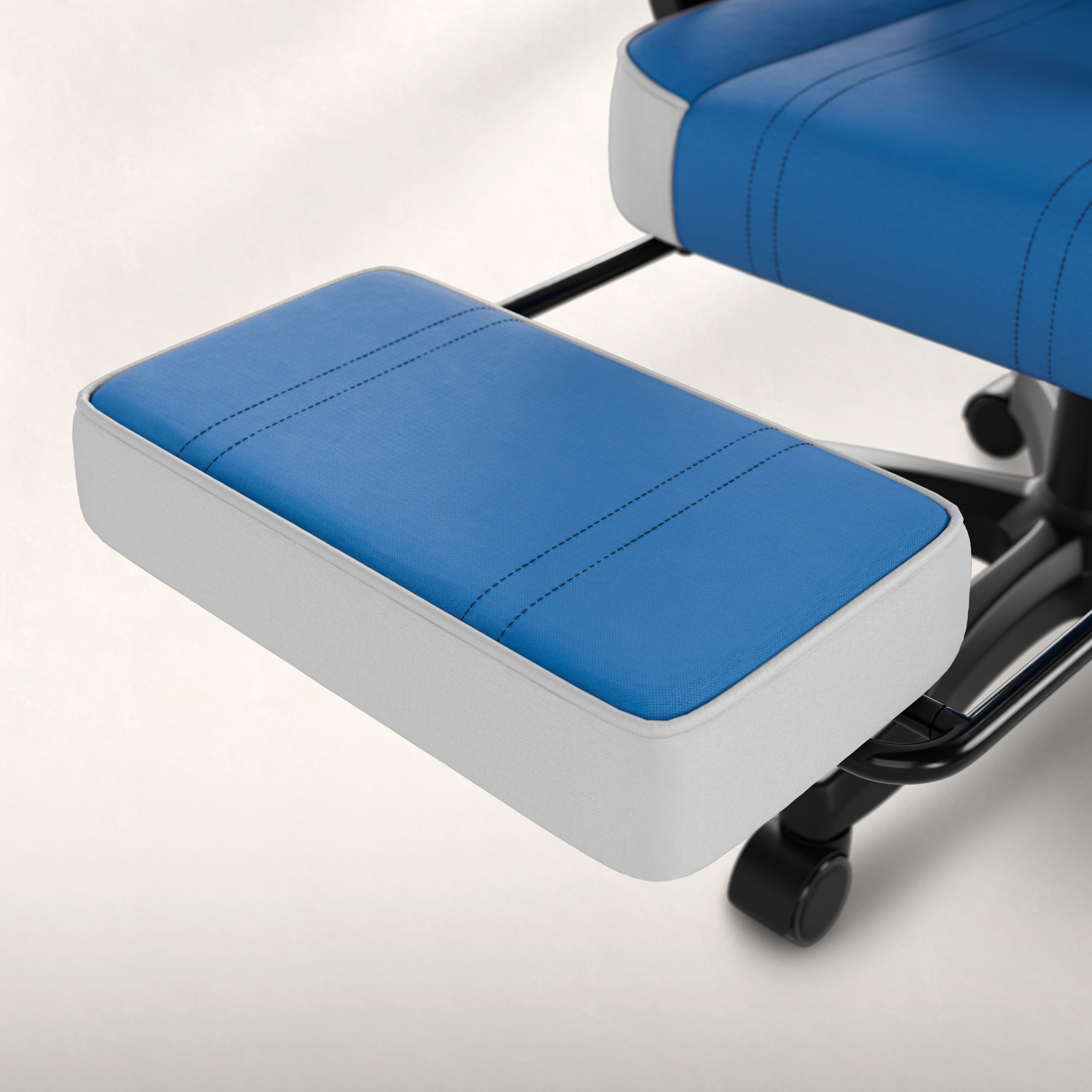 Dodatkowym atutem fotela jest rozkładany podnóżek, pozwalający na pełne rozluźnienie i wygodne wyciągnięcie nóg. Stabilność i płynną regulację wysokości siedziska zapewnia trwały siłownik gazowy klasy 3 BIFMA. Całość osadzona jest na poliuretanowo-kauczukowych kołach o średnicy 50 mm, które nie tylko chronią podłogę przed zarysowaniami, ale także gwarantują ciche i płynne przemieszczanie fotela.