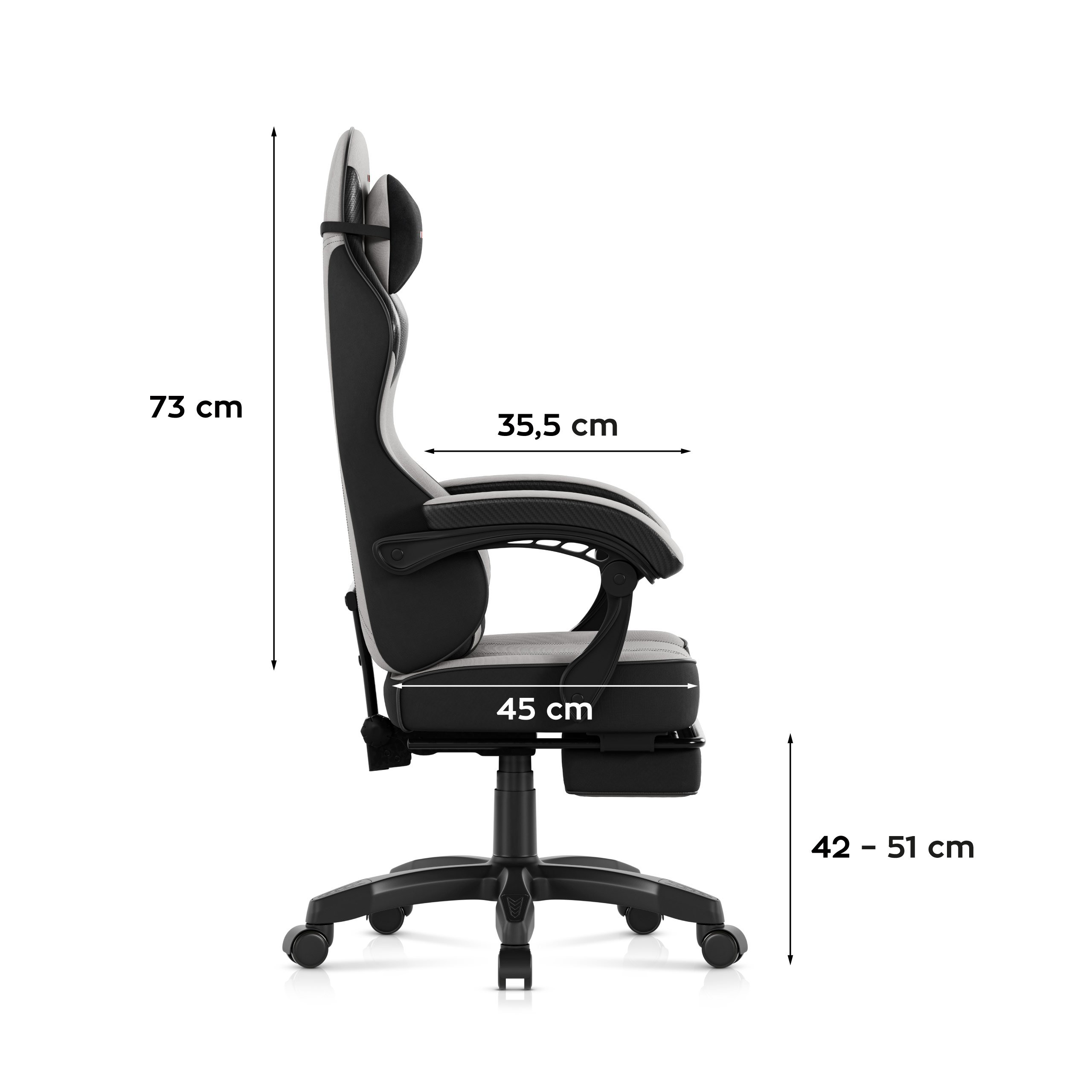 Dodatkowym atutem fotela jest rozkładany podnóżek, pozwalający na pełne rozluźnienie i wygodne wyciągnięcie nóg. Stabilność i płynną regulację wysokości siedziska zapewnia trwały siłownik gazowy klasy 3 BIFMA. Całość osadzona jest na poliuretanowo-kauczukowych kołach o średnicy 50 mm, które nie tylko chronią podłogę przed zarysowaniami, ale także gwarantują ciche i płynne przemieszczanie fotela.