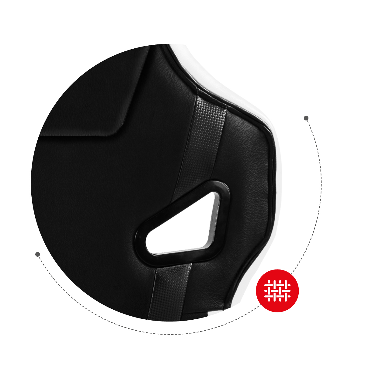 Obicie fotela wykonano z łączonych materiałów dla jeszcze lepszego efektu. Część tekstylna zapewnia optymalną cyrkulację powietrza i najwyższy komfort użytkowania nawet podczas letnich upałów. Elementy obicia, które wykonano ze skóry ekologicznej są gładsze, łatwe w czyszczeniu i niezwykle efektowne.