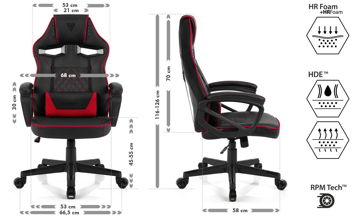 Kompleksowość modelu Knight wyrażona jest w zaawansowanej budowie oraz nienagannym stylu. Fotel, za sprawą przemyślanego wyprofilowania zapewnia najwyższy level komfortu, utrzymując prawidłową postawę kręgosłupa, a przygotowane warianty kolorystyczne umożliwiają wybór pomiędzy gamingową bestią a eleganckim meblem do pracy.