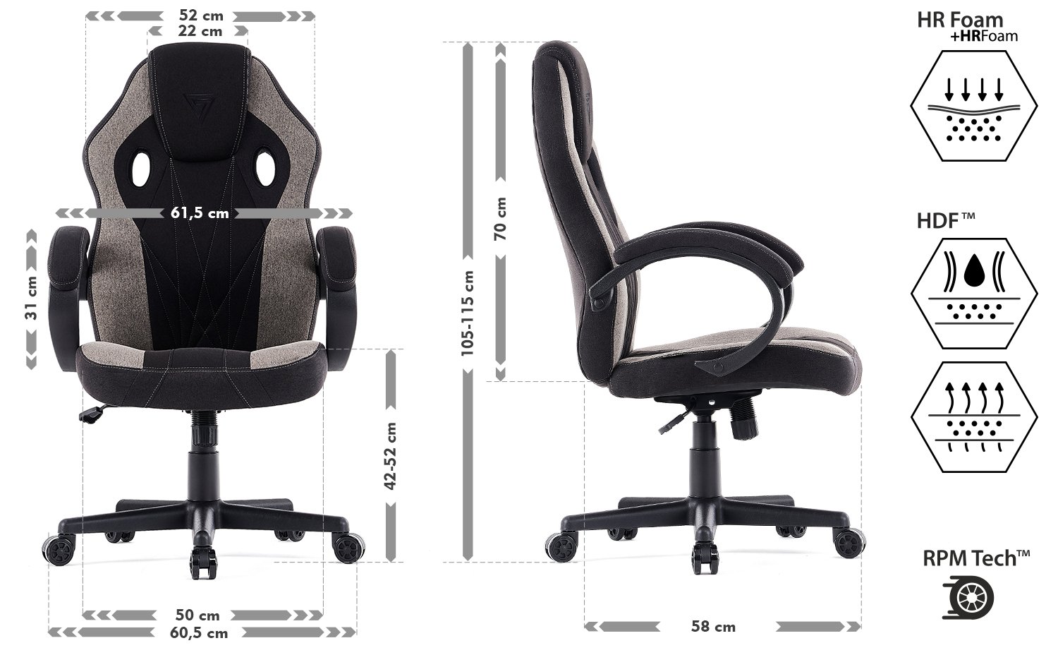 Tapicerka fotela została wykonana z tkaniny HDF™, która doskonale odprowadza wilgoć i zapewnia cyrkulację powietrza, dzięki czemu możesz zapomnieć o nieprzyjemnym efekcie przyklejania.. Materiał ten charakteryzuje się bardzo dobrą wytrzymałością, a także łatwo utrzymać go w czystości.