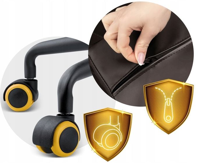 Poduszki można wyjąć z pokrowca dzięki wszytemu zamkowi, a solidna metalowa podstawa wyposażona jest w nylonowo-kauczukowe kółka, które poruszają się cicho i nie rysują podłogi.