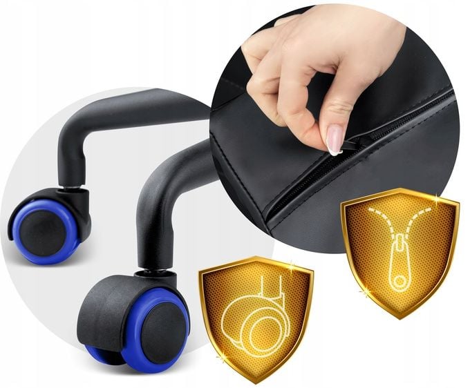 Poduszki można wyjąć z pokrowca dzięki wszytemu zamkowi, a solidna metalowa podstawa wyposażona jest w nylonowo - kauczukowe kółka, które poruszają się cicho i nie rysują podłogi.