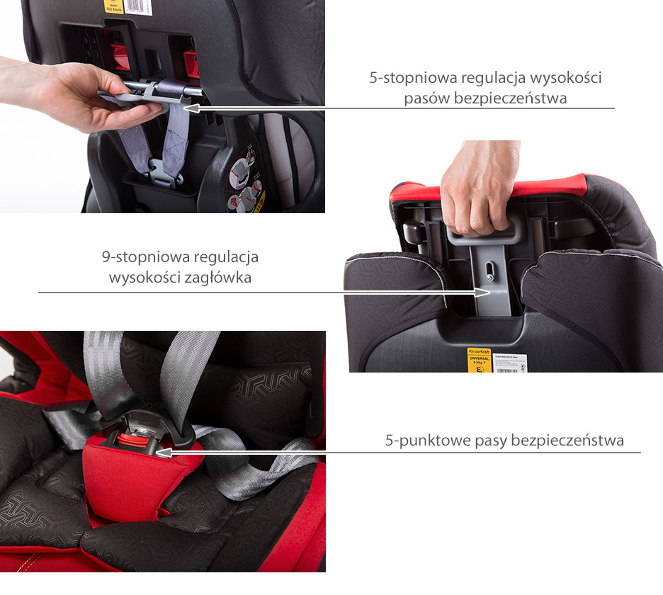 marki Kinderkraft został poddany szczegółowym badaniom technicznym i uzyskał certyfikat bezpieczeństwa ECE R44/04 obowiązującą w Polsce oraz Unii Europejskiej.