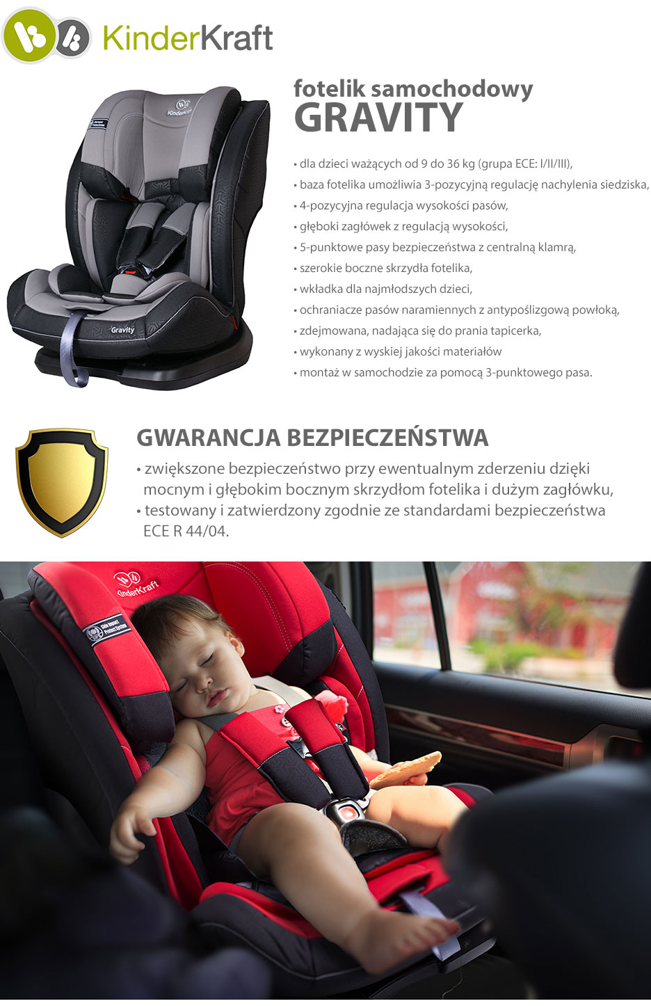 od 9 kg do 36 kg (grupa ECE I / II / III) przedział wiekowy określa się od 9 miesięcy do 11 lat. Fotelik GRAVITY