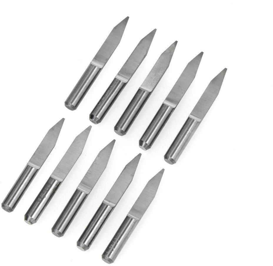 Frez o profilu V przeznaczony do urządzeń tnących CNC. Kąt nachylenia ostrza frezu wynosi 30°. Produkt wykonany został z odpornej na zginanie stali wolframowej o zwiększonej odporności na zużycie. Dodatkowo pokryty jest warstwą tytanu. Znajduje zastosowanie w wielu dziedzinach przemysłu, m.in. w elektronice do nawiercania płytek PCB. Może być wykorzystywany również do cięcia tworzyw PCV, miedzi, aluminium, drewna i płyt pilśniowych. W zestawie znajduje się 10 sztuk frezów. Produkt sprzedawany jest w plastikowym etui ułatwiającym przechowywanie. Ostrza dodatkowo zabezpieczono gumową nakładką.