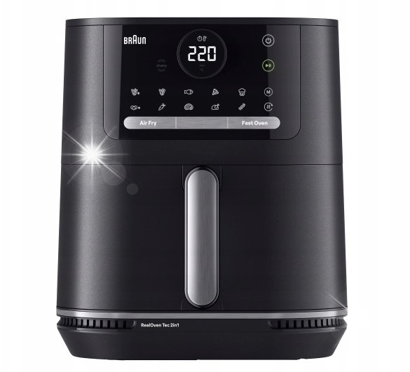 Frytkownica ma kompaktowe wymiary 27 x 33,5 x 28 cm, co sprawia, że łatwo znajdziesz dla niej miejsce w swojej kuchni. Jej elegancki czarny kolor doskonale wpasuje się w nowoczesne wnętrza.