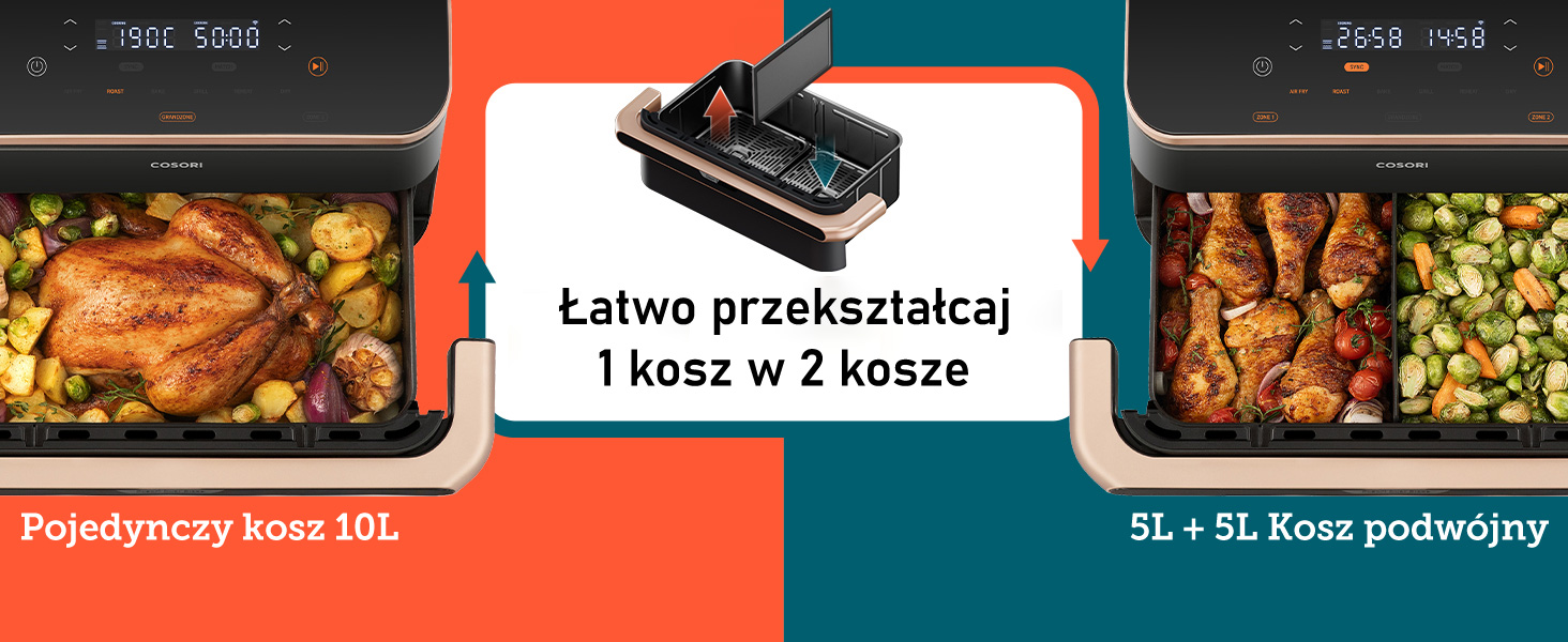 Frytkownica Cosori Dual Blaze TwinFry oferuje rekordową pojemność 10 litrów, którą można elastycznie podzielić na dwie niezależne strefy gotowania o pojemności 5 litrów każda. Umożliwia to jednoczesne przygotowywanie dwóch różnych dań, każde z własnymi ustawieniami czasu, temperatury i programu. Funkcja synchronizacji "Sync" sprawia, że oba dania kończą się w tym samym momencie, co jest nieocenione przy serwowaniu pełnego posiłku. Duża, jednolita komora (Grandzone) pomieści nawet całego kurczaka, co czyni urządzenie niezwykle wszechstronnym.