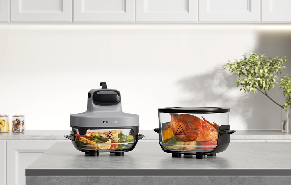 Dreame Tasti PT60 oferuje możliwość korzystania z dwóch pojemności naczyń, co sprawia, że urządzenie doskonale dopasowuje się do różnych potrzeb kulinarnych. Mniejsze naczynie o pojemności 2,5 litra idealnie sprawdza się przy przygotowywaniu szybkich porcji dla jednej osoby, natomiast większe naczynie o pojemności 4,5 litra pozwala bez problemu upiec nawet kurczaka o wadze około 1,5 kilograma. Dzięki temu jedno urządzenie może służyć zarówno do codziennych, szybkich posiłków, jak i większych dań dla całej rodziny.