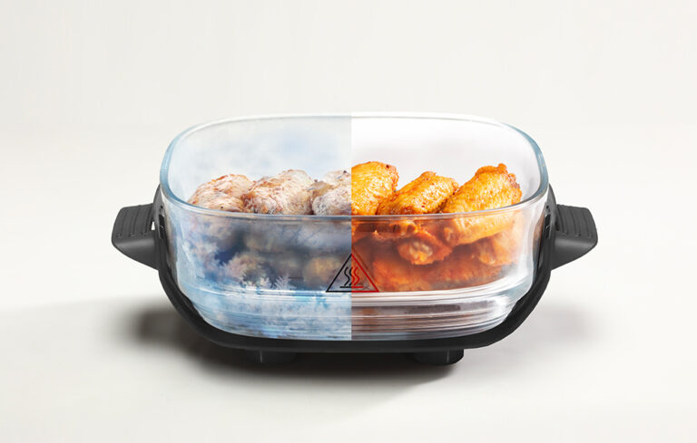 Komora gotowania została wykonana z grubego szkła borokrzemowego o wysokiej zawartości tlenku boru, które cechuje się dużą odpornością na temperaturę oraz zmiany termiczne. Materiał ten nie posiada powłok chemicznych, dlatego podczas gotowania nie powstają nieprzyjemne zapachy ani potencjalnie szkodliwe substancje. Dodatkowo taca do pieczenia została wykonana ze stali nierdzewnej 304, a uchwyty są izolowane termicznie, co zwiększa komfort i bezpieczeństwo użytkowania nawet przy wysokiej temperaturze.