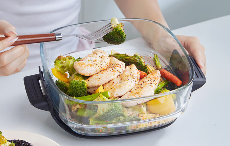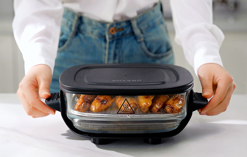 Przezroczyste szklane naczynie zapewnia panoramiczny widok 360°, który pozwala obserwować potrawy przez cały proces przygotowania. Dzięki temu możesz kontrolować stopień przypieczenia i konsystencję jedzenia bez otwierania urządzenia i utraty temperatury. To praktyczne rozwiązanie, które ułatwia gotowanie i sprawia, że osiągnięcie idealnego efektu jest znacznie prostsze.