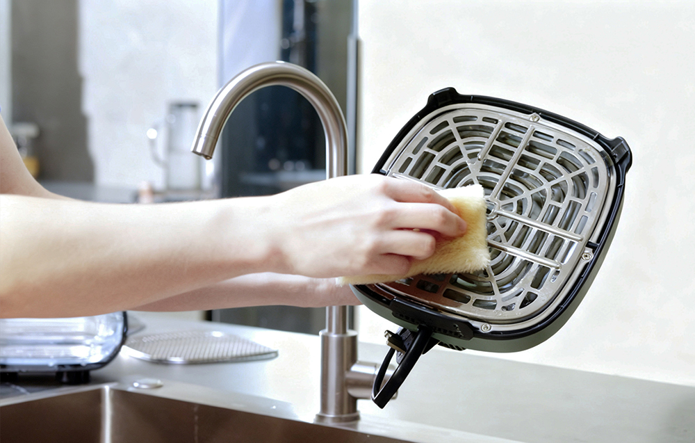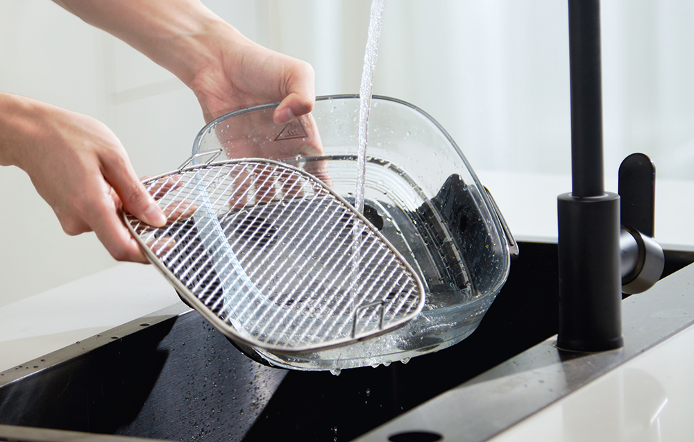 Przemyślana budowa urządzenia sprawia, że utrzymanie go w czystości jest wyjątkowo łatwe. Moduł grzewczy z matową obudową można szybko przetrzeć, a szklane naczynia oraz taca do pieczenia zostały zaprojektowane tak, aby można je było bez problemu myć lub namaczać, również w zmywarce. Dzięki modułowej konstrukcji każdy element można łatwo wyjąć i wyczyścić, co znacząco skraca czas sprzątania po gotowaniu i sprawia, że korzystanie z frytkownicy pozostaje wygodne nawet przy codziennym użytkowaniu.