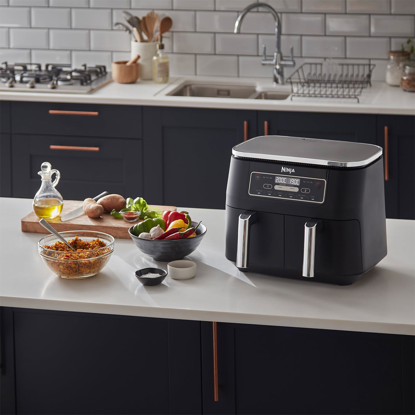 Różne potrawy, różne czasy przyrządzania, różne programy – obydwa dania będą gotowe jednocześnie! Dzięki dwóm oddzielnym szufladom możesz łączyć lub dopasowywać programy gotowania i czas przyrządzania. Bardzo duża pojemność 7,6 l dla maks. 8 osób. Każda szuflada mieści do 1 kg frytek lub 1,6 kg kurczaka.
