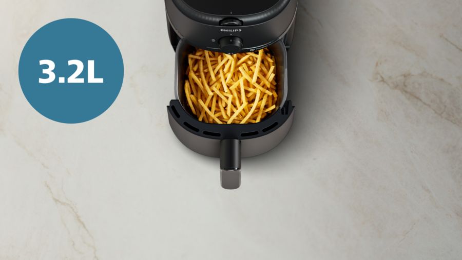Zwarta konstrukcja jest odpowiednia dla kuchni o każdym rozmiarze. Patelnia o pojemności 3,2 l mieści do 400 g frytek, 4 udka z kurczaka lub 400 g warzyw.