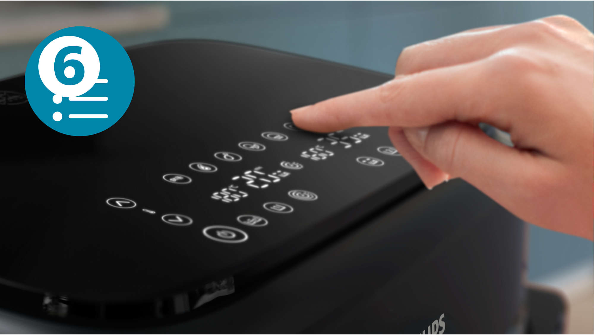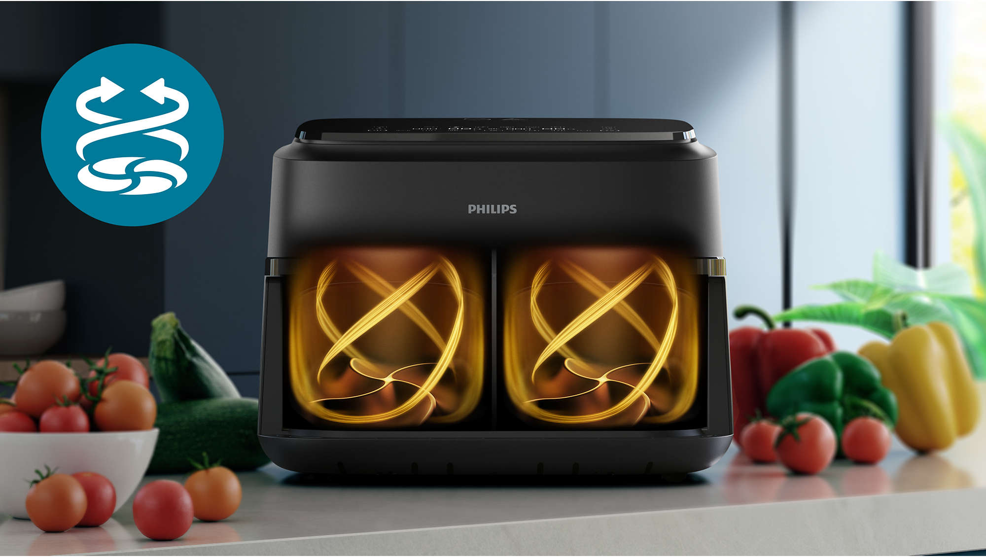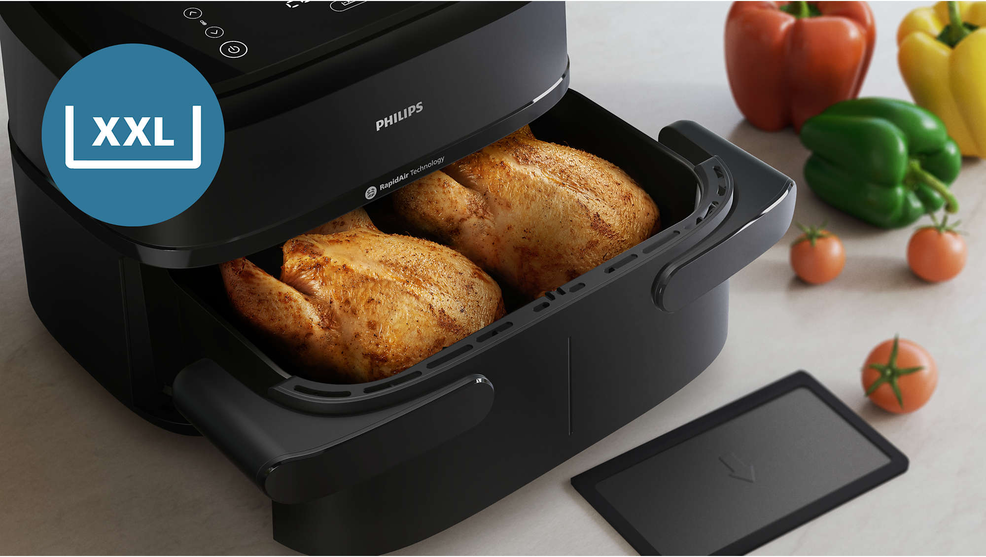 Zastosowana technologia RapidAir z unikalną konstrukcją spodu w kształcie gwiazdy wymusza szybki i równomierny przepływ gorącego powietrza wokół potraw. Dzięki temu dania są wyjątkowo chrupiące na zewnątrz i soczyste w środku. System ten pozwala na redukcję zawartości tłuszczu w potrawach nawet o 90%, stanowiąc zdrowszą alternatywę dla tradycyjnego smażenia głębokiego.