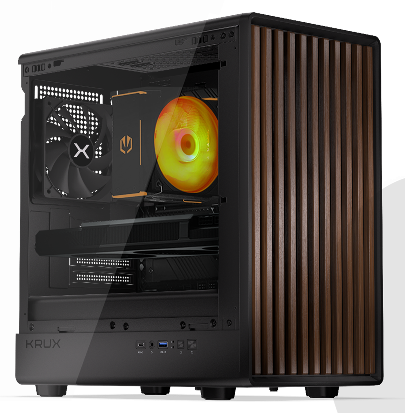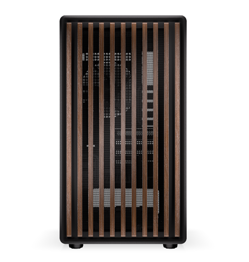 Bardzo dobrze wyposażona obudowa o świetnych parametrach wentylacji, panel przedni z drewnianymi lamelami zapewniający niepowtarzalny wygląd. Bok obudowy z hartowanego szkła pozwala na elegancką prezentację komputera. Frontowy panel wyposażony w złącza audio, USB oraz USB-C do ładowania urządzeń.