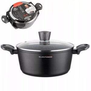 Garnek aluminiowy Bono o średnicy 24 cm i pojemności 4 litrów to znakomity wybór dla tych, którzy cenią nowoczesny design oraz funkcjonalność w kuchni. Jego elegancka, matowa czarna powłoka przypominająca kamień sprawia, że garnki te nie tylko prezentują się doskonale, ale również świetnie sprawdzają się w codziennym gotowaniu.