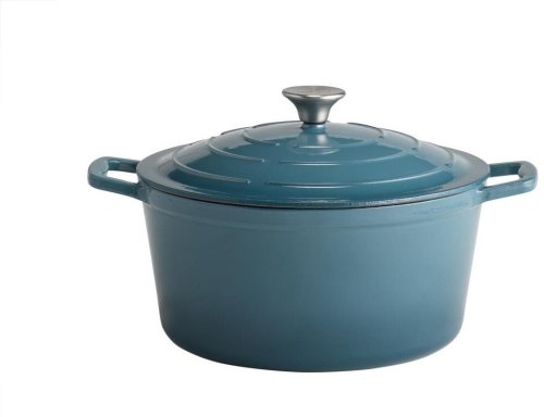 Garnek z pokrywką 5 STARS 6 L to solidny, żeliwny klasyk, który świetnie sprawdzi się do gotowania, duszenia i pieczenia. Emaliowane żeliwo równomiernie rozprowadza i długo utrzymuje ciepło, dzięki czemu potrawy dochodzą spokojnie, z pełnią smaku. Kremowe wnętrze ułatwia kontrolę gotowania i jest praktyczne w codziennym użytkowaniu, a zewnętrzne wykończenie w odcieniu turkusowo-niebieskim dodaje naczyniu elegancji i nowoczesnego charakteru. Pokrywka pomaga zachować aromat i wilgotność potraw, a stalowy uchwyt oraz praktyczny element do podparcia pokrywki zwiększają wygodę podczas pracy w kuchni.