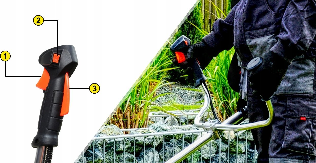 - Przyciski dźwigni przepustnicy są umieszczone w ergonomiczny sposób, aby zapewnić wygodny i intuicyjny dostęp. Dzięki nim użytkownik może łatwo regulować prędkość obrotową podkaszarki, dostosowując ją do warunków pracy oraz rodzaju roślinności.