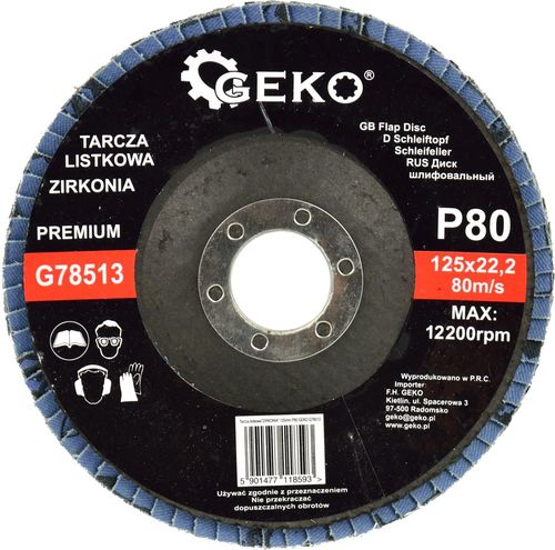 Tarcza listkowa 125mm P80 "ZIRKONIA" PREMIUM Tarcza listkowa klasy premium przeznaczona do obróbki stali nierdzewnej, stali stopowych itp. Listki tarczy z materiałem ściernym w postaci tlenku cyrkonu, osadzone na tarczy z włókna szklanego co gwarantuje równe szlifowanie, aż do całkowitego zużycia ziarna ściernego. Cechy produktu: Typ tarczy: listkowa wachlarzowa Rodzaj ziarna ściernego: tlenek cyrkonu Średnica zewnętrzna tarczy: 125 mm Średnica otworu montażowego: 22,2 mm Granulacja: 80 Maksymalna prędkość obrotowa: 12 200 obr./min Maksymalna prędkość liniowa: 80 m/s Zastosowanie: stal węglowa, stale stopowe, stal nierdzewna, blachy matalowe, stale obrabiane cieplnie, żeliwo, stale narzędziowe, metale kolorowe