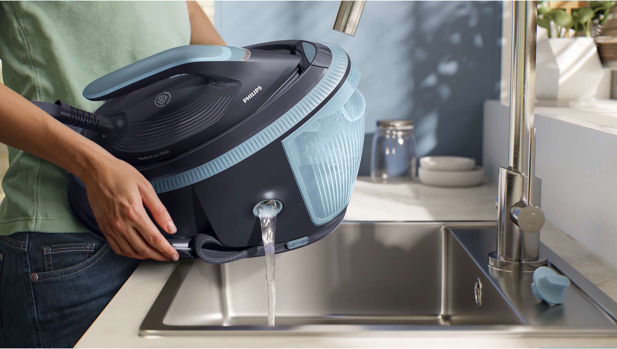 Regularne odkamienianie chroni żelazko, wydłuża jego żywotność i zapewnia najlepszą wydajność. Nasz wyjątkowy system Easy De-Calc zbiera kamień, a lampka kontrolna informuje o konieczności jego opróżnienia. Wystarczy wyjąć zatyczkę i pozwolić wodzie oraz cząsteczkom kamienia wypłynąć.