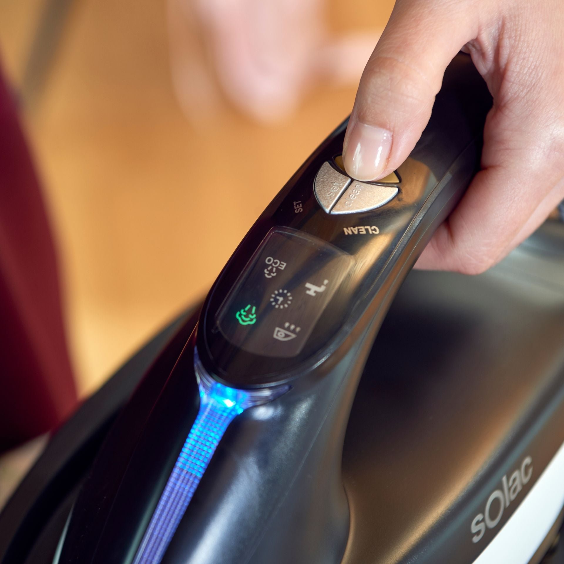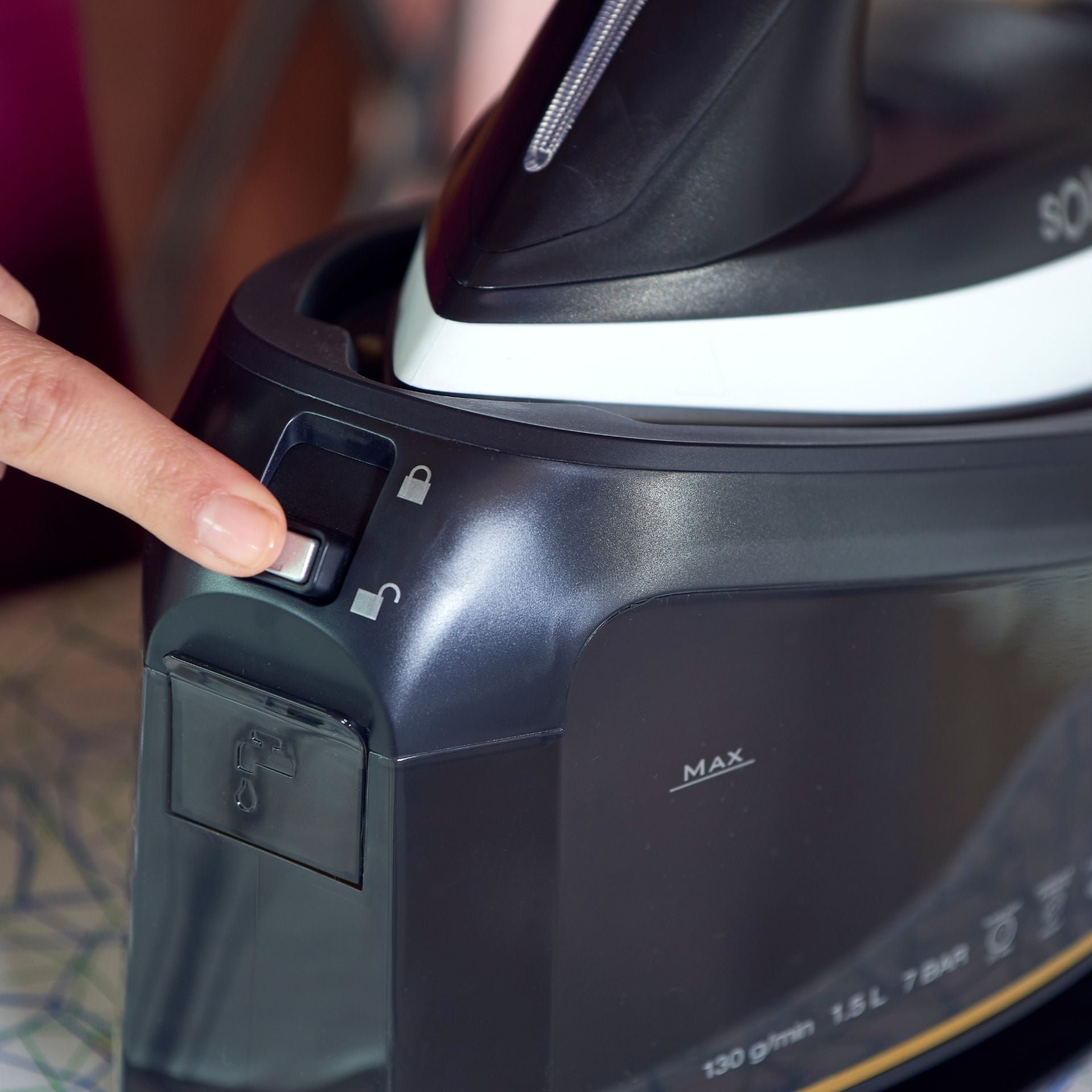 Generator posiada opatentowany system blokowania i transportu firmy Solac, który pozwala bezpiecznie przymocować żelazko do bazy, co ułatwia przenoszenie całego urządzenia.