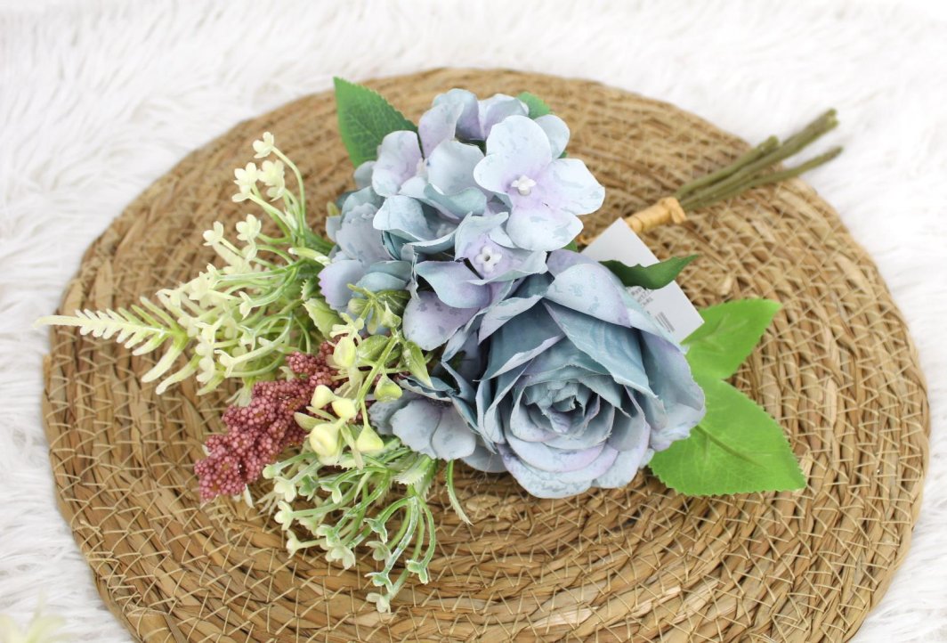 Gigabyte bukiet mieszany RÓŻA, HORTENSJA wys. 32 cm, 5 łodyg w pęczku (2 kwiaty 7-6 cm) NIEBIESKI WT-191D