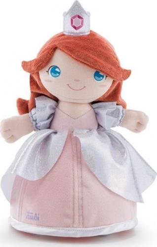 Lalka przytulanka Crystal, ubrana w piękną różową sukienką z błyszczącą baskinką, rękawkami i koroną.