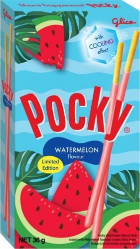 Pocky Watermelon to wyjątkowa, tropikalnie zakręcona odsłona deserowych pałeczek. Patyczki pokryte słodkim kremem arbuzowym na bazie białej czekolady, za sprawą dodatku fenyloalaniny pozostawiają w ustach przyjemne, chłodzące wrażenie, które odświeży Cię jak porcja lodów w upalny dzień. Chrup prosto z paczki lub po schłodzeniu w lodówce; doskonale sprawdzą się samodzielnie lub w towarzystwie szklanki mleka.