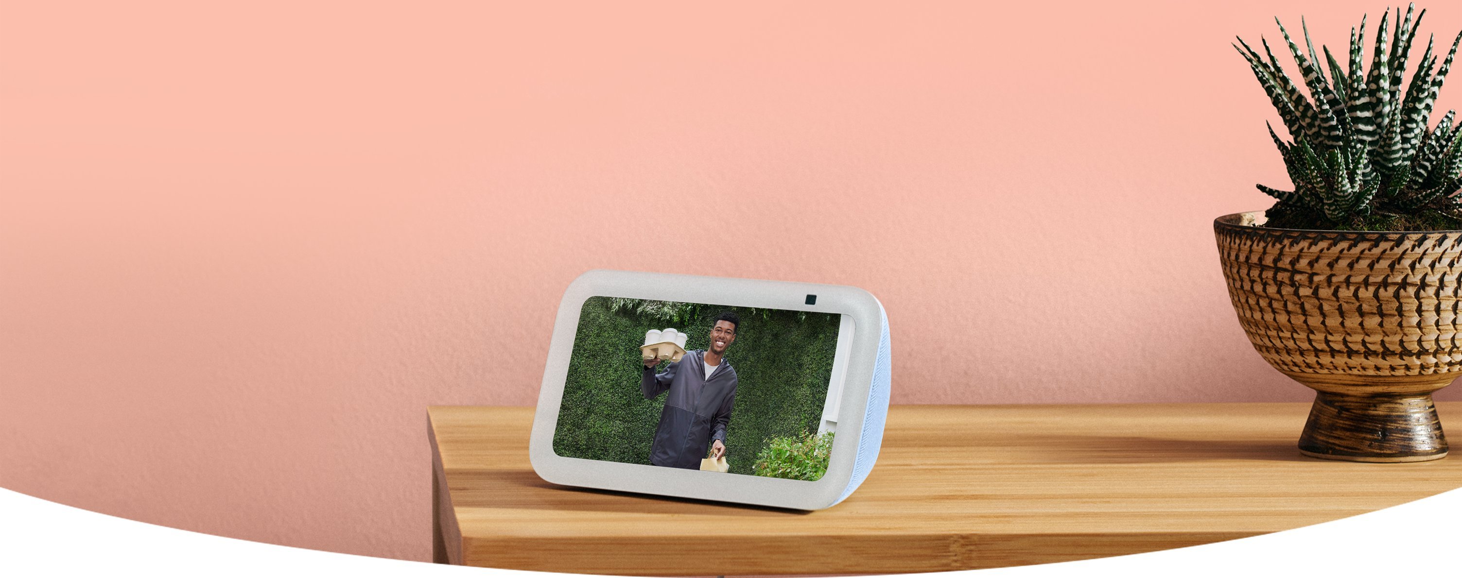 Użyj wbudowanej kamery, aby zajrzeć do swojej rodziny, zwierząt domowych i innych, nawet gdy jesteś poza domem. Zobacz drzwi wejściowe z Echo Show 5 za pomocą kompatybilnych wideodomofonów.