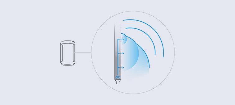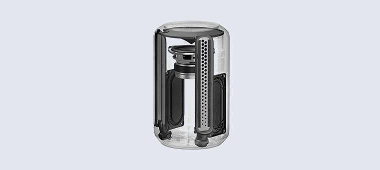 Dyfuzor omnipolarny rozprzestrzenia dźwięk poziomo po całym pomieszczeniu, a dwie membrany bierne zapewniają głęboki bas.