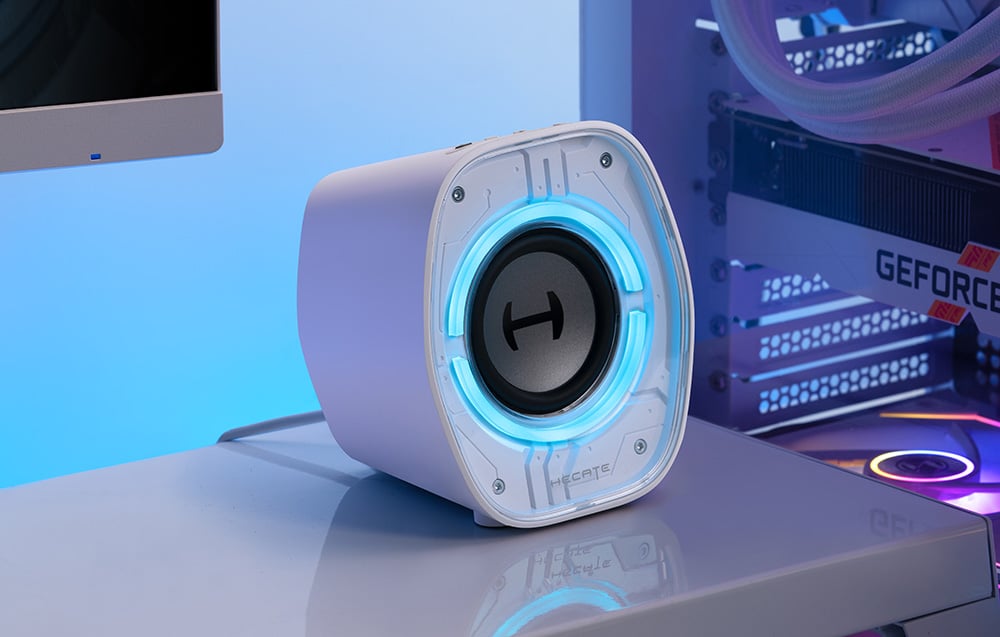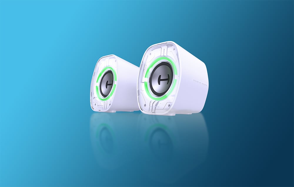 W projekcie obudowy zadbano o każdy detal. Delikatne pochylenie konstrukcji o 10 stopni poprawia kierunkowość dźwięku i redukuje jego odbicia od biurka, co pozytywnie wpływa na słyszalność wysokich tonów. Przezroczysta pokrywa z efektem lustrzanego tłoczenia nadaje futurystycznego wyglądu, a gumowe, antypoślizgowe podkładki gwarantują stabilność.