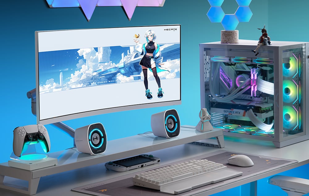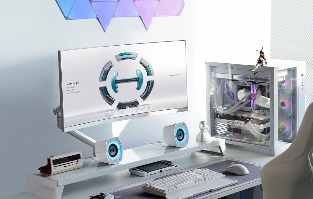 Edifier G1000 II to głośniki stworzone specjalnie z myślą o graczach i użytkownikach komputerów stacjonarnych, którzy szukają wydajnego sprzętu o gamingowym charakterze. Niewielkie wymiary sprawiają, że idealnie sprawdzają się na małych biurkach, nie zajmując wiele miejsca, a jednocześnie oferują brzmienie, które potrafi zaskoczyć głębią i mocą. Charakterystyczna, futurystyczna obudowa z 9 trybami podświetlenia RGB przyciąga wzrok i dobrze komponuje się zarówno z gamingowym zestawem, jak i minimalistycznym stanowiskiem.