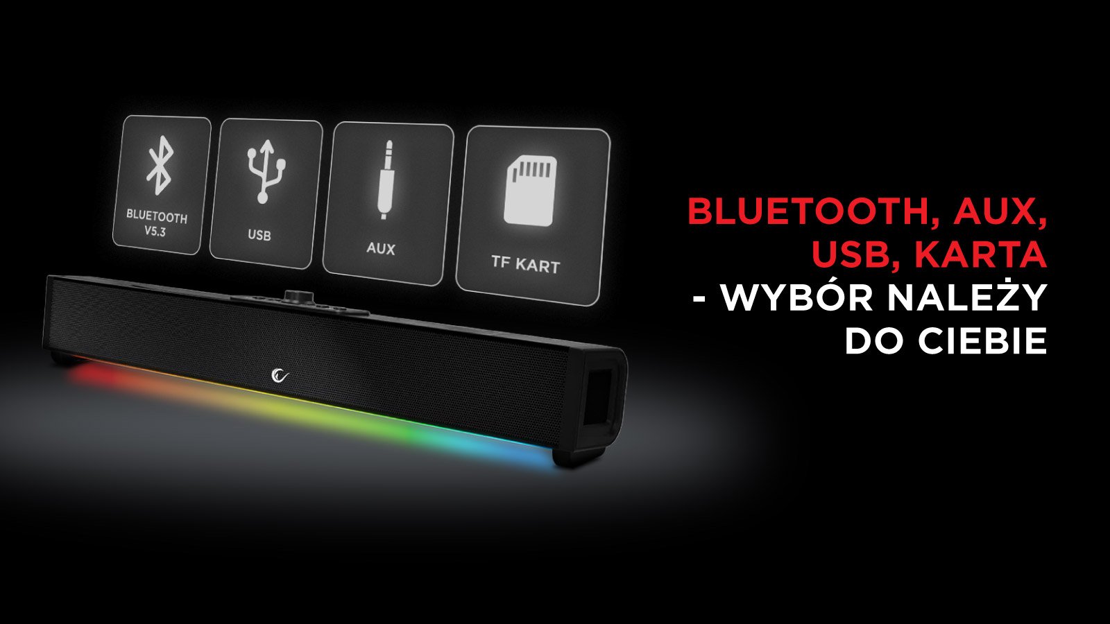 Soundbar obsługuje cztery popularne metody łączności: Bluetooth, USB, AUX i kartę TF. Dzięki temu możesz łatwo podłączyć komputer, konsolę, laptop, smartfon czy pamięć przenośną i natychmiast cieszyć się dźwiękiem – bez zbędnych przejściówek i komplikacji.
