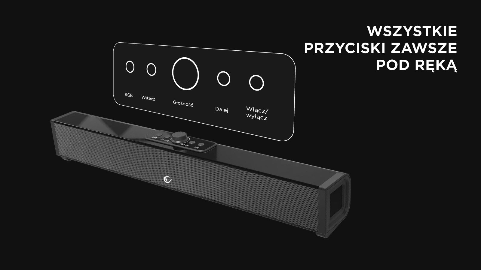 - Zestaw zawiera: soundbar Rampage RM-1, przewód zasilający, przewód AUX