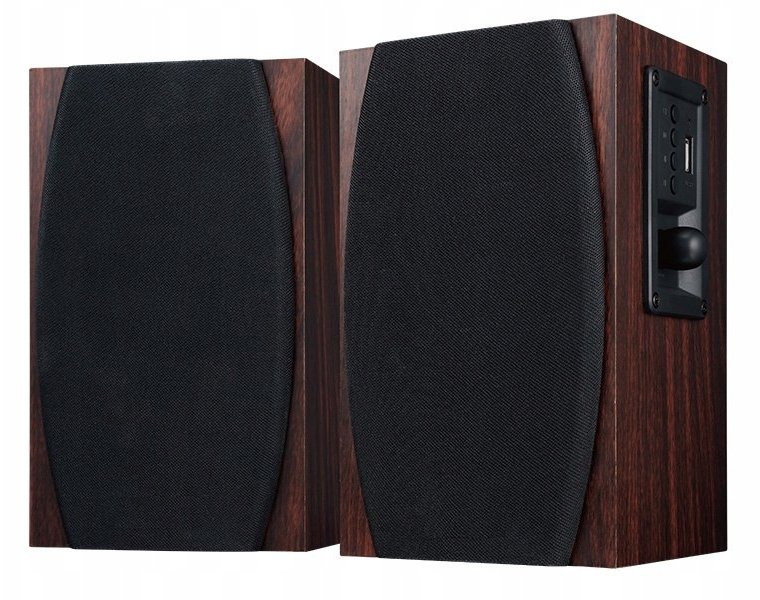 Głośniki wyróżniają się eleganckim, czarno-brązowym wykończeniem z drewna, które nie tylko prezentuje się estetycznie, ale także wpływa na jakość dźwięku. Idealnie wkomponują się w każde wnętrze, nadając mu nowoczesny charakter.