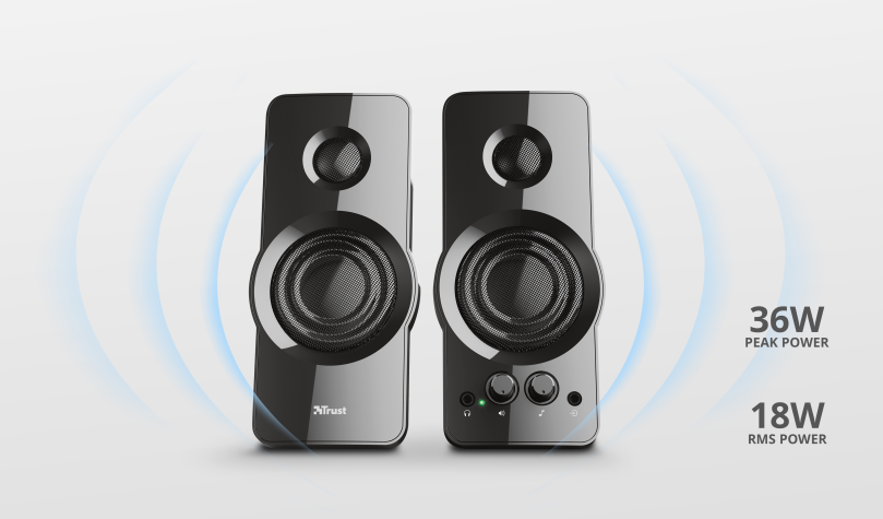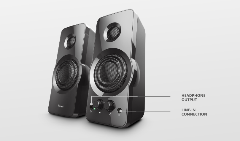 Kompaktowe głośniki z łatwościa dopasują się w twoje stanowisko. Proste sterowanie, dzięki łatwo dostępnym przyciskom do regulacji głośności i bassów. Podłącz słuchawki do portu aux i słuchaj w prywatności. Masz także możliwość podpięcia telefonu, tabletu, czy innego urządzenia.