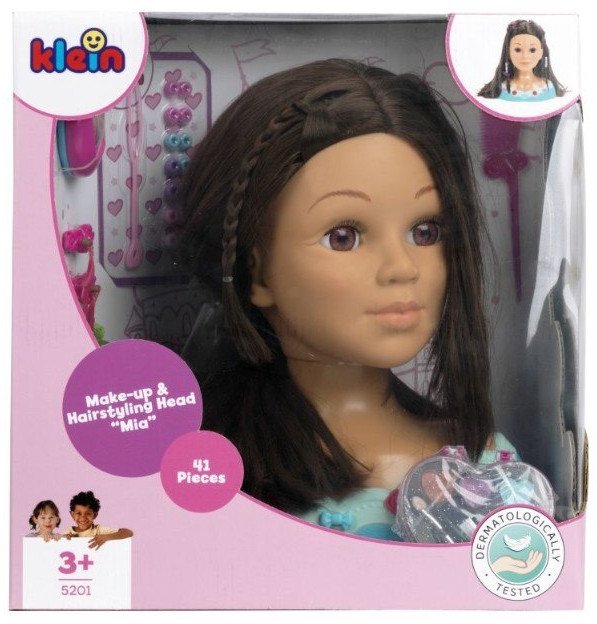 5201 Głowa do makijażu i fryzjerstwa Mia I Ładna, 27-centymetrowa głowa do stylizacji włosów dla dzieci, z włosami nadającymi się do mycia i czesania, zawiera dermatologicznie testowany zestaw kosmetyków w kształcie serca oraz akcesoria do włosów. Kosmetyczne serce zawiera błyszczyk do ust, cień do powiek i róż. Zestaw akcesoriów do włosów i przyborów fryzjerskich zawiera szczotkę, grzebień, dwa pasma włosów, zestaw koralików do włosów, siedem spinek do włosów, dwie spinki do beretu, osiem spinek dekoracyjnych do tułowia i spinek do beretu, a także arkusz naklejek, instrukcję ze wskazówkami dotyczącymi stylizacji i wiele więcej. Uwaga, królowie stylizacji i królowe piękności uwolnijcie swoją kreatywność! Ta śliczna głowa oferuje nieograniczone możliwości zabawy z włosami i makijażem: Sięgające ramion blond włosy tej ślicznej głowy fryzjerskiej można myć, czesać, szczotkować i ozdabiać spinkami, koralikami i kolorowymi pasemkami według uznania. Przyjazna buzia czeka tylko na ozdobienie błyszczykiem, cieniem do powiek i różem. Wszystko, czego potrzebują mali styliści, znajduje się w uroczym pudełku w kształcie serca. Theo Klein poddał kosmetyki dla dzieci dokładnej kontroli dermatologicznej, dzięki czemu można je stosować nie tylko na wytrzymałej, zmywalnej lalce, ale także na delikatnej skórze dzieci.Nr katalogowy: 5201 Wymiary: 23,5 x 13 x 27 cm Akcesoria w zestawie: Kosmetyczne serce Akcesoria do włosów ...