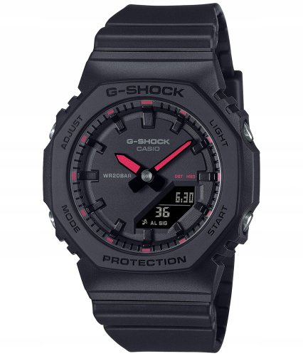 Zegarek GMA-P2100SA -1A1ER charakteryzuje się eleganckim, czarnym kolorem, który doskonale wpisuje się w sportowy styl. Jego nowoczesny design sprawia, że jest idealnym dodatkiem do każdej stylizacji, zarówno casualowej, jak i sportowej.