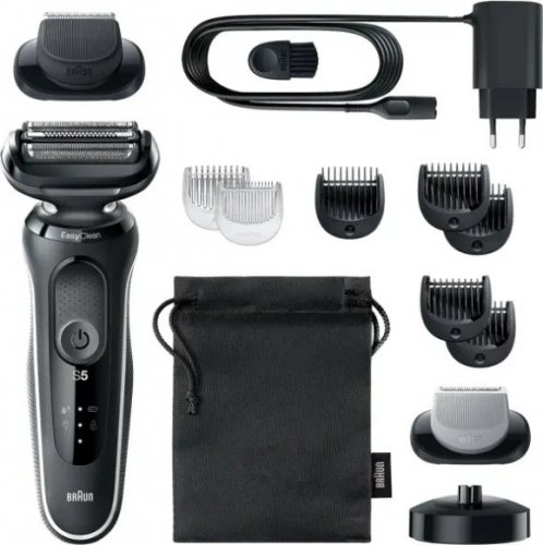 Golarka elektryczna dla mężczyzn Braun Series 5 ułatwia golenie dzięki 3 elastycznym ostrzom, które dostosowują się do konturów twarzy. System EasyClean sprawia, że czyszczenie jest szybkie i łatwe, bez konieczności zdejmowania głowicy golącej. Bateria litowo-jonowa zapewnia do 3 tygodni golenia oraz możliwość szybkiego, 5-minutowego doładowania. Ta elektryczna maszynka dla mężczyzn jest w 100% wodoodporna i można ją stosować na mokro i na sucho. Kompatybilna z systemem EasyClick.