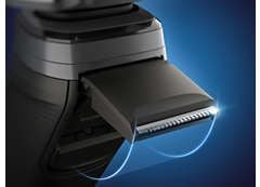 Dopełnij swój wygląd, używając wysuwanego, precyzyjnego trymera. Jest zintegrowany z korpusem golarki, dzięki czemu z łatwością przytniesz wąsy lub baki.